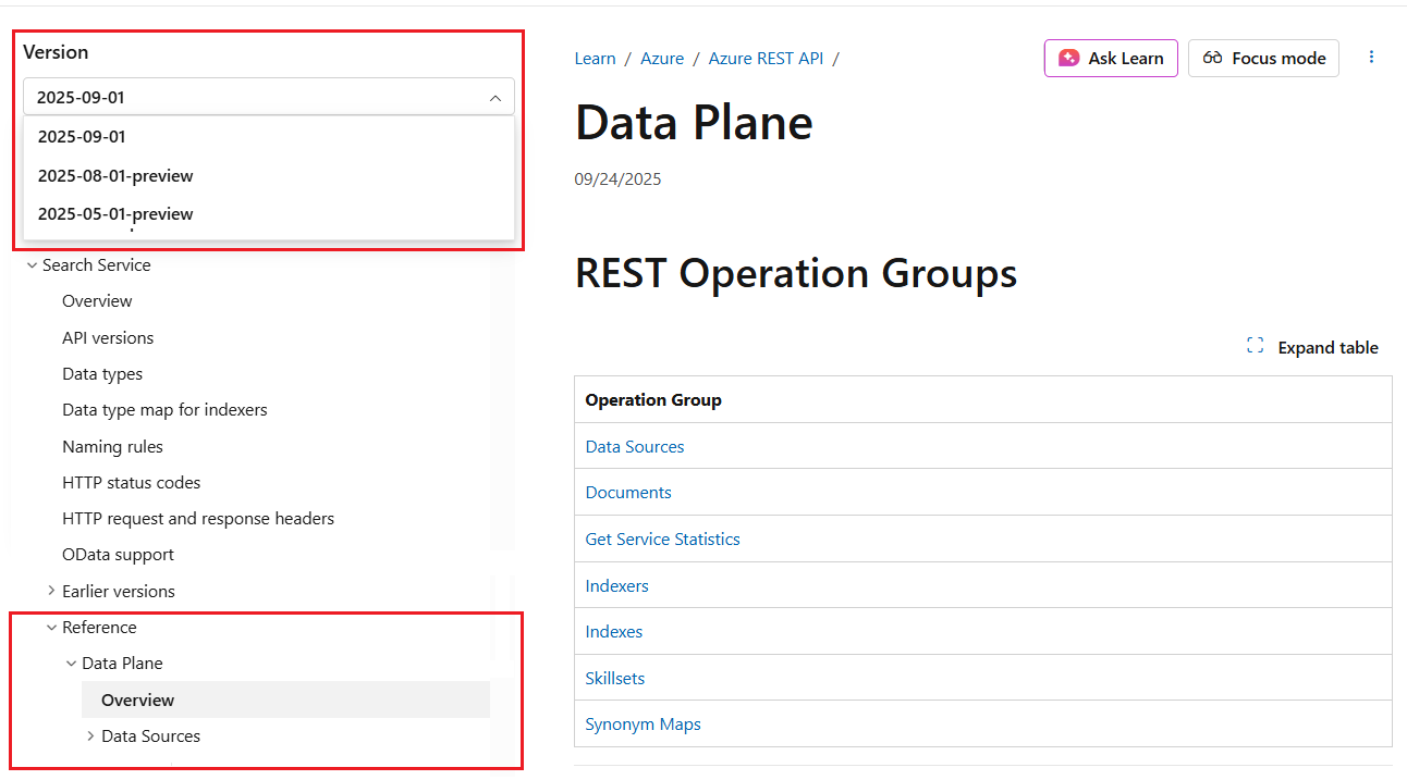 Un selector de versiones aparece encima de la tabla de contenido al seleccionar un artículo de referencia de API. El selector está disponible al elegir una página de la carpeta Plano de datos de referencia>.