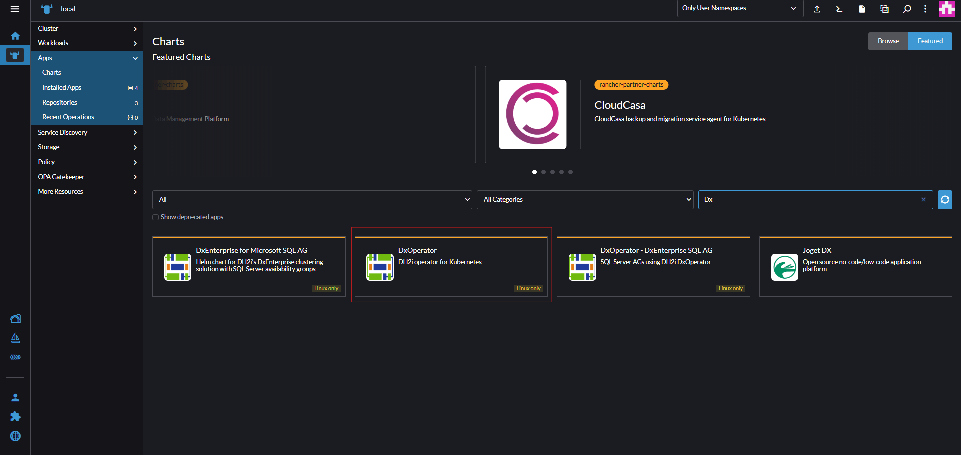 Para continuar, seleccione el clúster de Kubernetes donde desea instalar DxOperator. En este ejemplo, elija un clúster local que también tenga implementado Rancher. Sin embargo, debe importar o agregar otro clúster de Kubernetes y usar ese clúster para implementar SQL Server, para evitar que los pods de Rancher y SQL Server se ejecuten en el mismo clúster de Kubernetes.