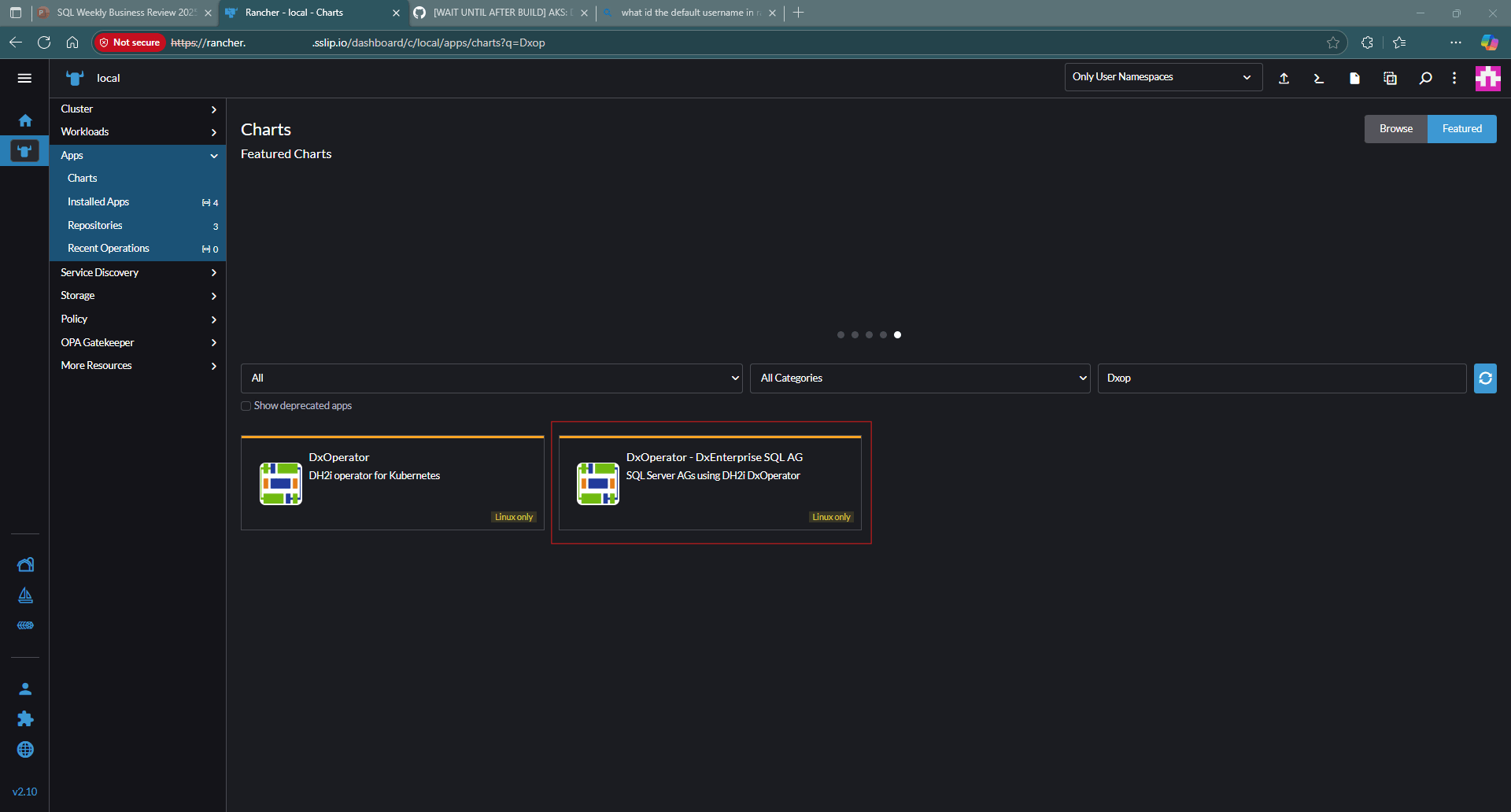 DxOperator es una extensión de software para Kubernetes que usa definiciones de recursos personalizadas para automatizar la implementación de clústeres de DxEnterprise. DxEnterprise proporciona toda la instrumentación necesaria para crear, configurar, administrar y proporcionar conmutación automática por error para las cargas de trabajo de los grupos de disponibilidad (AG) de SQL Server en Kubernetes. Puede registrarse para obtener una licencia gratuita de software dxEnterprise. Para obtener más información, consulte la Guía de inicio rápido de DxOperator. Para problemas de soporte técnico, póngase en contacto directamente con SUSE.