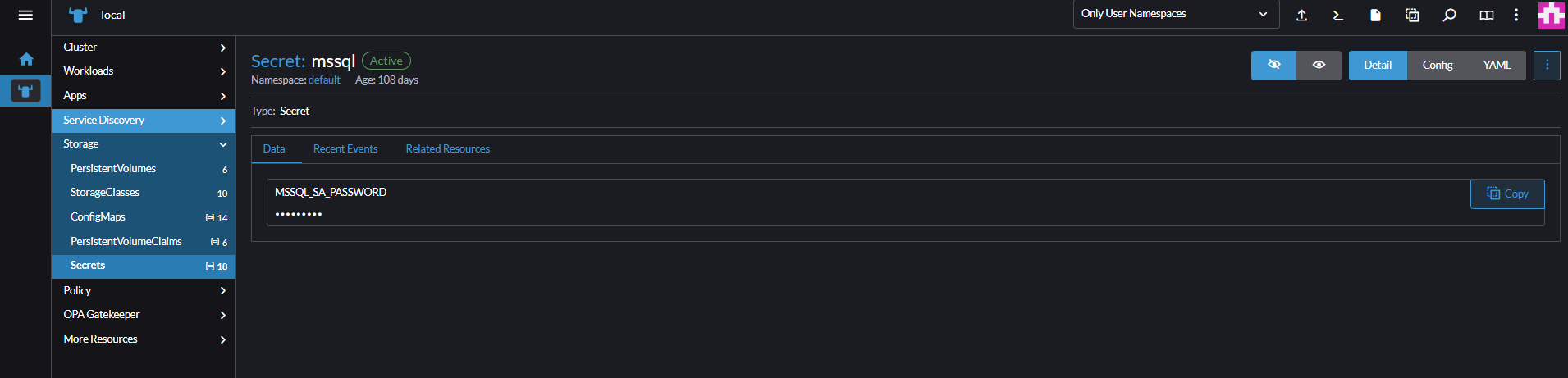 mssql, establezca el nombre de clave comoMSSQL_SA_PASSWORDcon un valor de una contraseña segurasa.Seleccione Crear para terminar de crear el secreto.