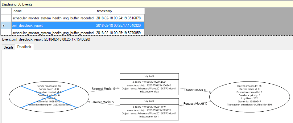 Puede ver los detalles del interbloqueo en el ring_buffer destino de la system_health sesión de eventos, que por defecto está habilitada y activa en SQL Server y Azure SQL Managed Instance. Considere la siguiente consulta: