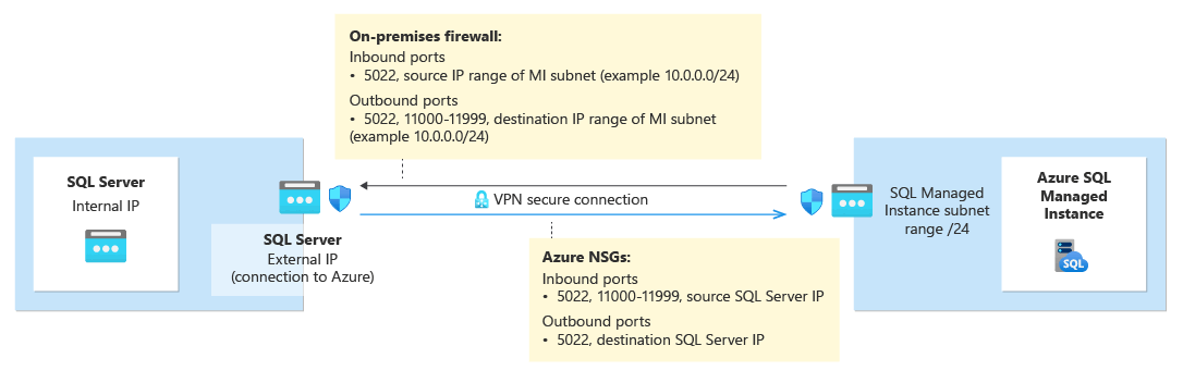 - Las configuraciones avanzadas del firewall con límites de protección de nivel de paquete deben configurarse correctamente para permitir el tráfico entre SQL Server y SQL Managed Instance.