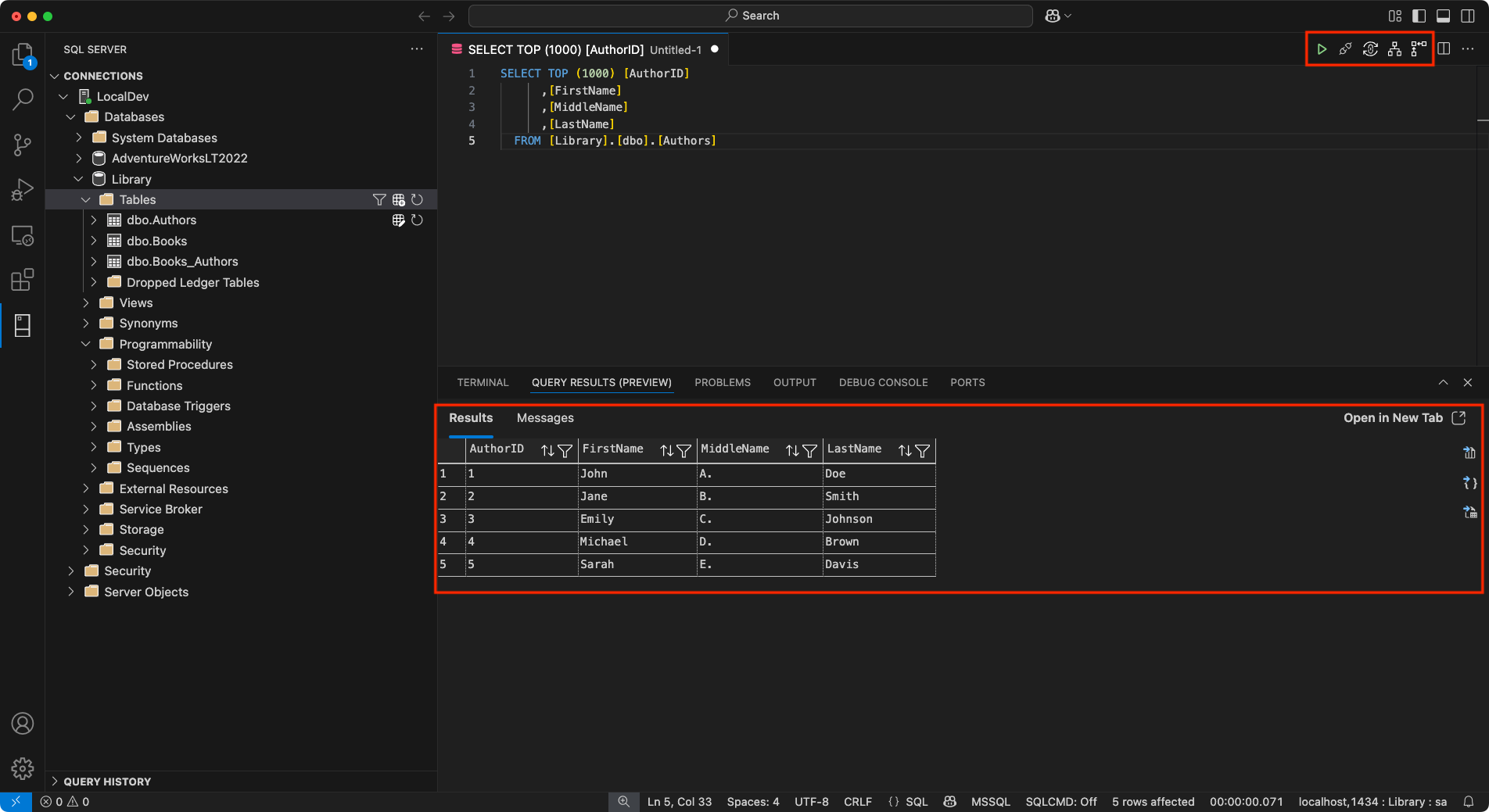 Los resultados de la consulta se muestran en el panel inferior de Visual Studio Code, junto con el terminal integrado, la salida, la consola de depuración y otras herramientas.