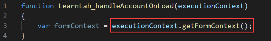 Antes, se podía acceder al elemento o formulario mediante el objeto global Xrm.Page. Sin embargo, en la última versión, el objeto Xrm.Page está en desuso. En su lugar, debe usar el método getFormContext del objeto de contexto de ejecución para obtener una referencia al formulario o elemento apropiado del formulario. Por tanto, en lugar de escribir código como el siguiente: