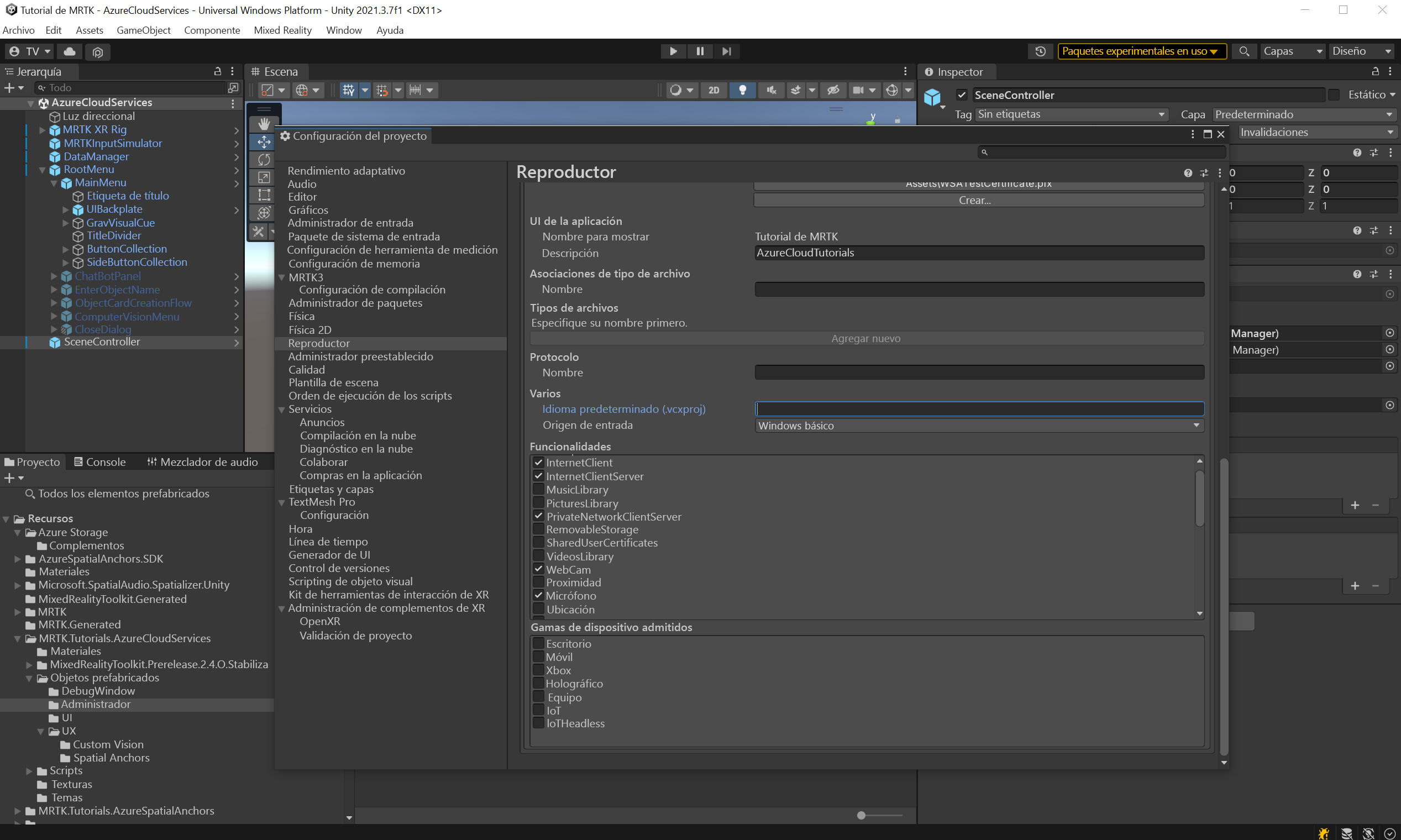 Antes de finalizar la escena, vamos a preparar el proyecto que se va a compilar para HoloLens 2.