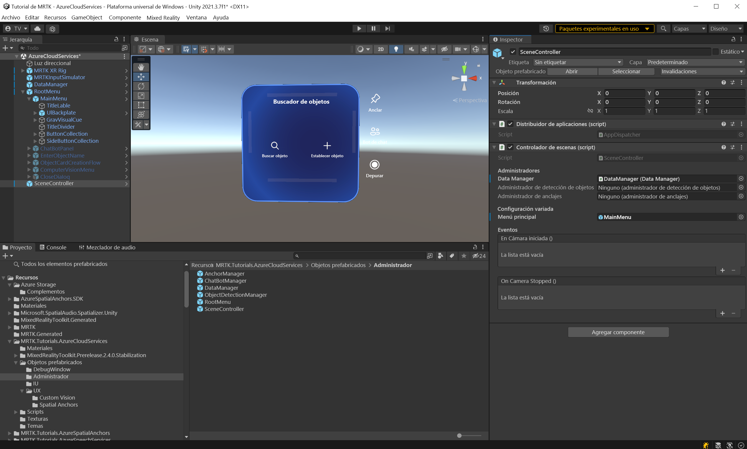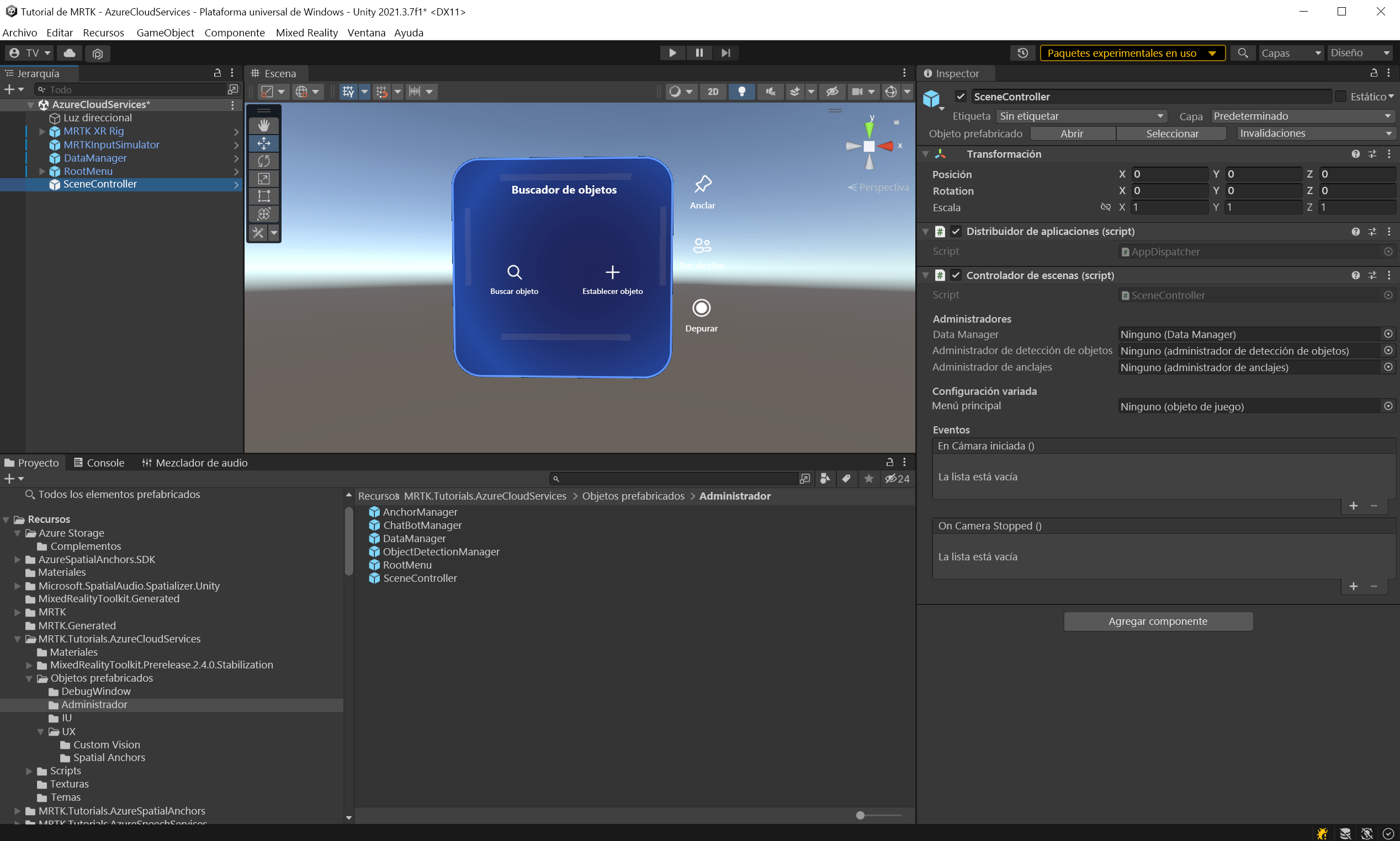 SceneController (prefabricado) contiene dos scripts, SceneController (script) y UnityDispatcher (script). El componente de script SceneController contiene varias funciones de experiencia de usuario y facilita la funcionalidad de captura de fotos, mientras que UnityDispatcher es una clase auxiliar para permitir la ejecución de acciones en el subproceso principal de Unity.