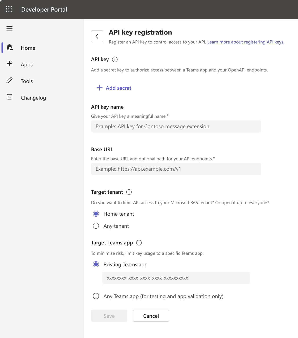 Durante el desarrollo, puede registrar su clave de API de desarrollo en el almacén manualmente, ya sea en el Portal para desarrolladores de Teams y en la sección Herramientas , abriendo el registro de claves de API, o bien mediante microsoft 365 Agents Toolkit. En producción, normalmente un administrador registra la clave de API y le proporciona el identificador de la entrada del almacén que se va a usar en el complemento de API.