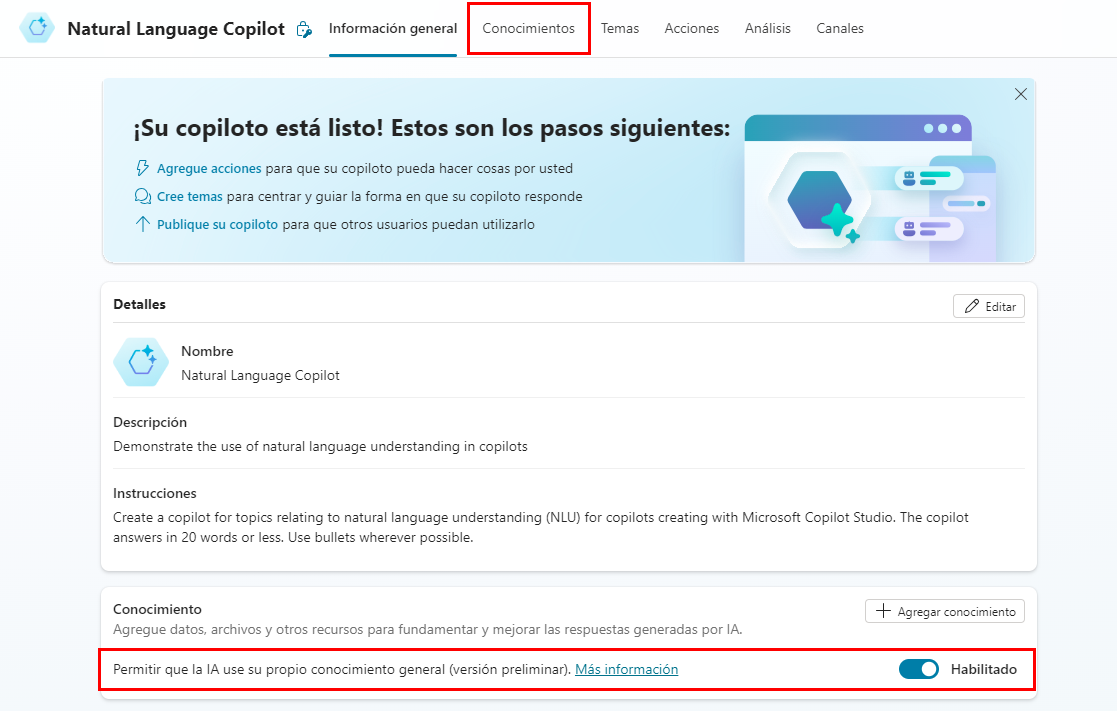 En Detalles, dentro de la sección Conocimiento de la página Descripción general, seleccione el indicador Permitir que la IA utilice su propio conocimiento general a fin de deshabilitar el conocimiento general.