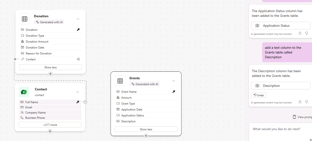 Copilot solo debería crear una tabla llamada Donation. Si se crearon más, puede eliminarlas diciéndole a Copilot el nombre de la tabla que desea eliminar.