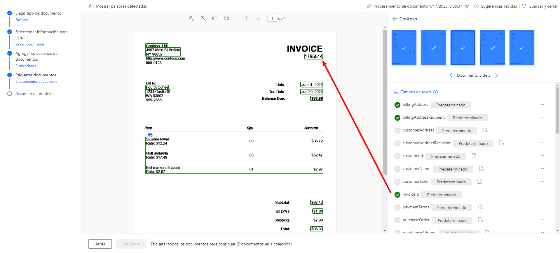 En el primer documento, AI Builder ya ha identificado algunos campos en nuestro documento, como billingAddress, billingAddressRecipient, invoiceId, vendorAddress, vendorAddressRecipient, amountDue, invoiceTotal, subTotal, totalTax, dueDate, invoiceDate y una tabla de elementos.
