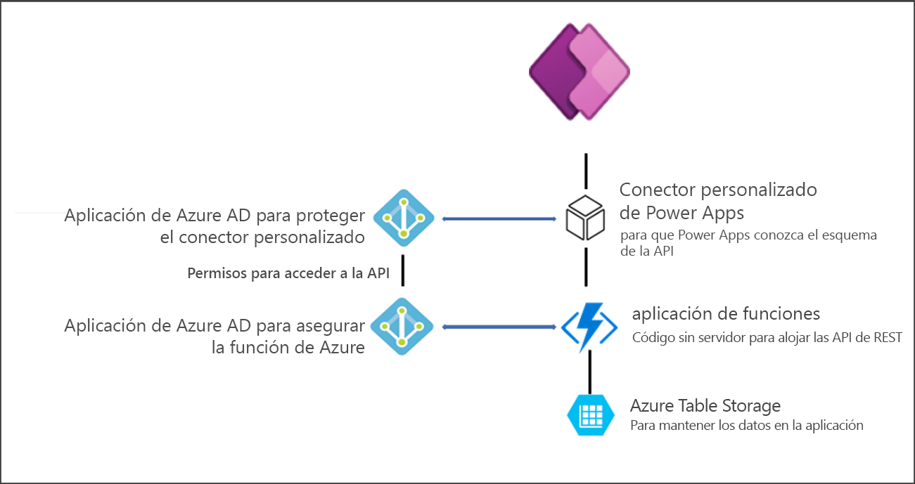 Azure Functions es un punto de conexión de extensibilidad admitido para Power Platform. La extracción de la lógica personalizada en una Azure Function le permite descargar la lógica compleja fuera de su aplicación transaccional, lo que ofrece una experiencia de usuario mucho más estable y efectiva. Azure Functions también se puede usar para crear API que están expuestas a Microsoft Power Platform, como un conector personalizado. Como conector personalizado, la lógica empresarial de Azure Functions se puede invocar fácilmente desde aplicaciones y flujos. El siguiente diagrama ilustra una aplicación que usa una Azure Function desde una aplicación de lienzo de Power Apps.