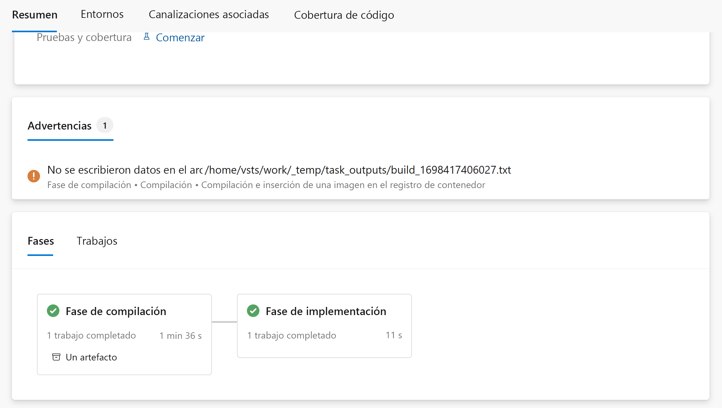 La canalización se completa correctamente. Seleccione la fase Implementar para ver los pasos.