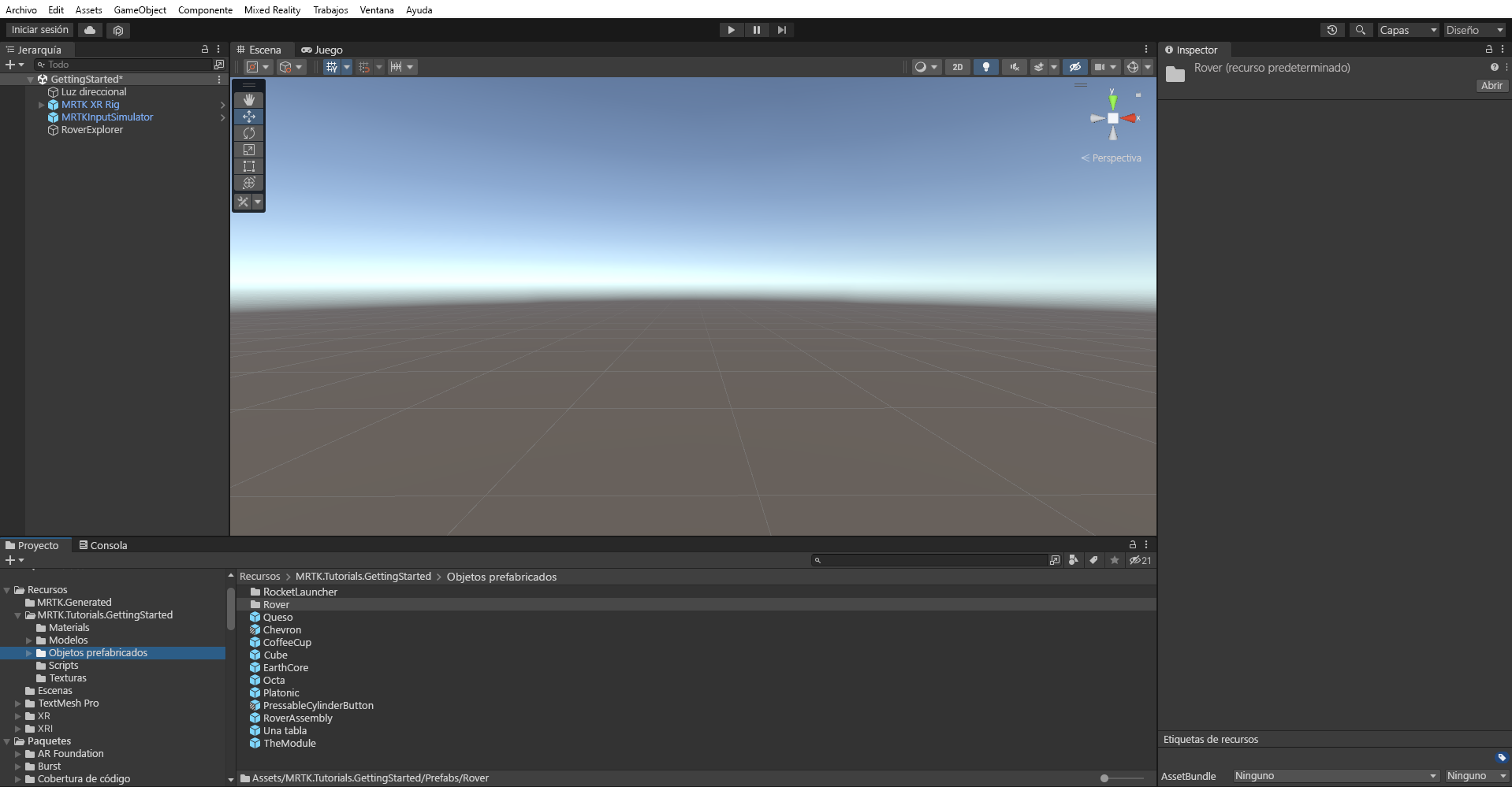 En la ventana Proyecto, vaya a Assets>MRTK.Tutorials.GettingStarted>Prefabs.