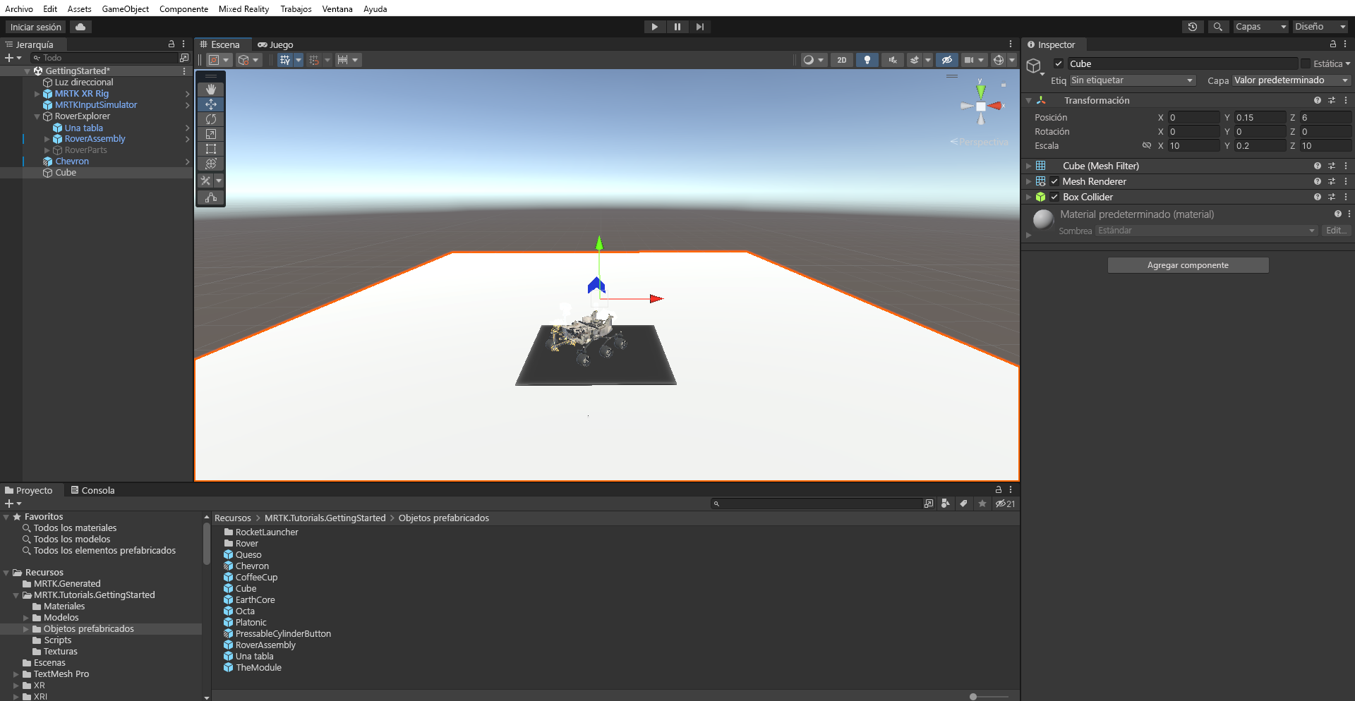 En la ventana Proyecto, vaya a Recursos>MRTK.Tutorials.GettingStarted>Prefabs. Arrastre el objeto Prefab Comilla angular a la ventana Jerarquía y establezca su Posición de transformación en X = 0, Y = 1.5, Z = 2 para colocarlo cerca del objeto RoverExplorer.