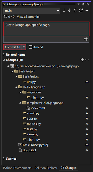 Después de actualizar el código de la aplicación Django y probar las actualizaciones, puede revisar y confirmar los cambios en el control de código fuente: