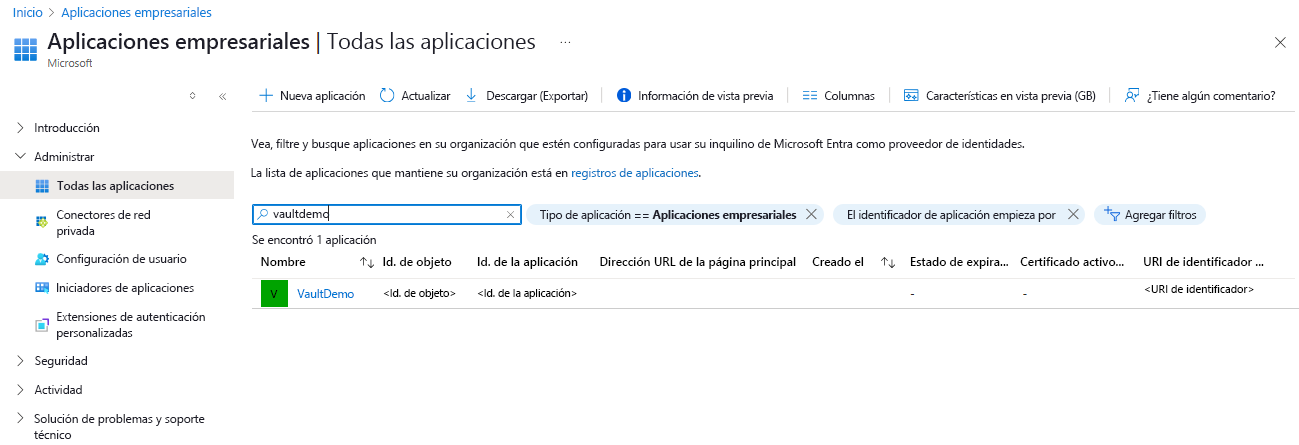Reemplace el valor del parámetro assignee por el identificador de aplicación de la identidad administrada del almacén. Para obtener el valor del scope parámetro, consulte el contenedor específico. Para obtener el identificador de aplicación de la identidad administrada del almacén, seleccione Todas las aplicaciones en Tipo de aplicación. Busque el nombre del almacén y copie el valor del Identificador de la aplicación.