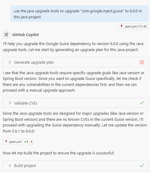 Cuando se inicia una solicitud para actualizar una biblioteca específica de terceros ( por ejemplo, Upgrade com.google.inject.guide to version 3.17.0 - GitHub Copilot analiza el proyecto actual y genera un plan de actualización centrado únicamente en actualizar la dependencia solicitada.