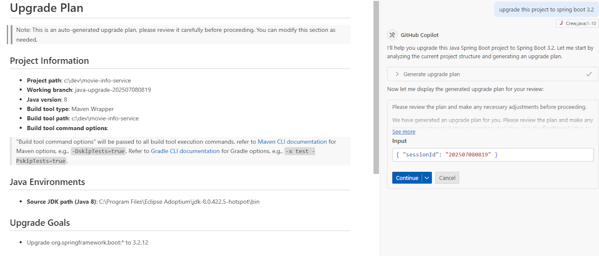 Si la versión actual de JDK no es compatible con la versión de la plataforma de destino (por ejemplo, al actualizar de JDK 8 a Spring Boot 3.2), la herramienta actualiza automáticamente el JDK a la versión mínima admitida que requiere el marco de trabajo , en este caso, JDK 17, además de realizar la actualización del marco.
