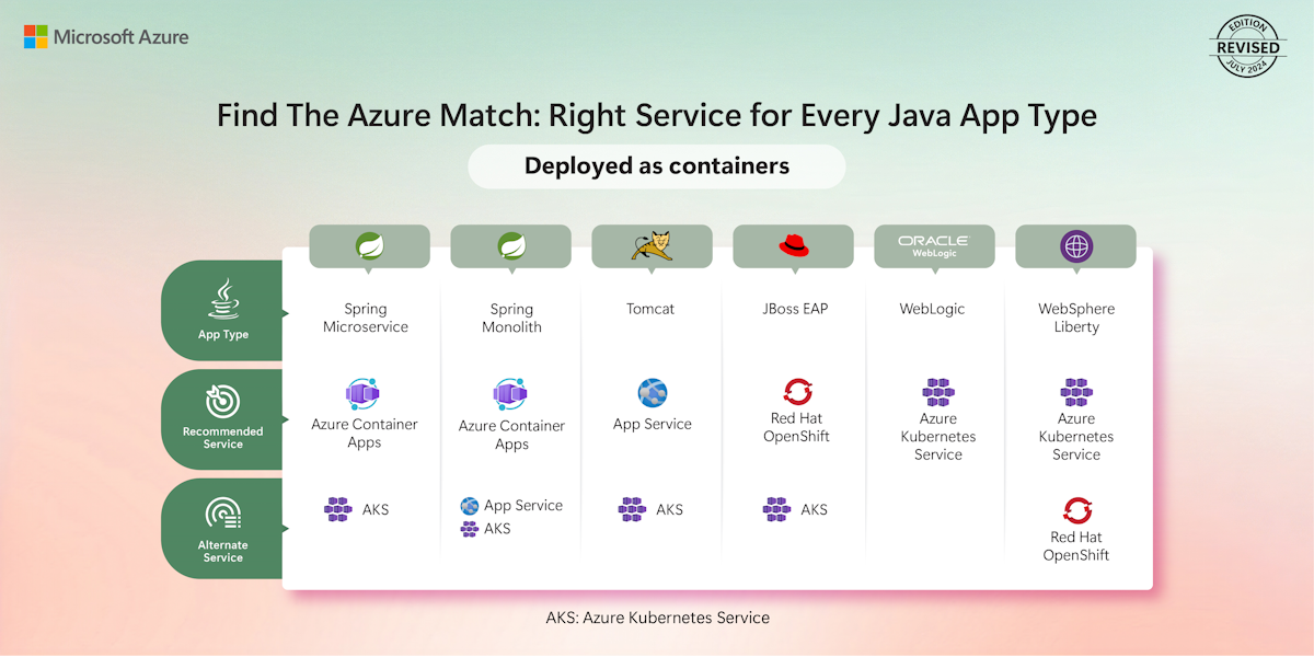 Diagrama donde se ven los servicios de Azure recomendados para cada tipo de aplicación Java implementada como contenedores.