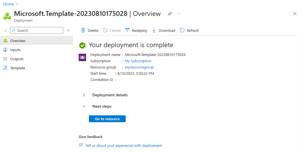 En la barra de herramientas, seleccione el símbolo de Notificaciones (una campana) para supervisar el proceso de implementación. Una vez realizada la implementación, puede seleccionar Anclar al panel para crear un icono para este servicio en el panel de Azure Portal como un acceso directo a la página Información general del servicio. Al seleccionar Ir al recurso, se abre la página Información general del servicio.