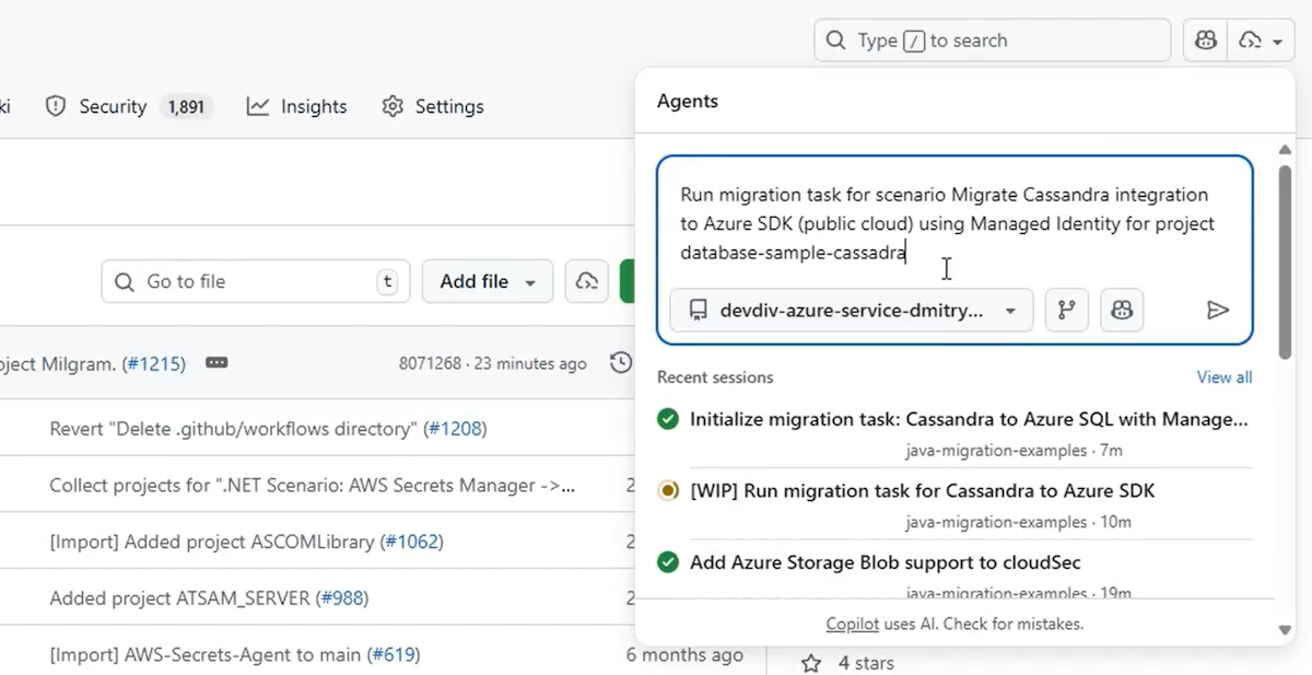Open the Agents panel in the top-right corner and enter your prompt. After the prompt is entered, Copilot starts a new session and opens a new pull request, which appears in the list below the prompt box. Copilot works on the task and then adds you as a reviewer when it's finished, triggering a notification.