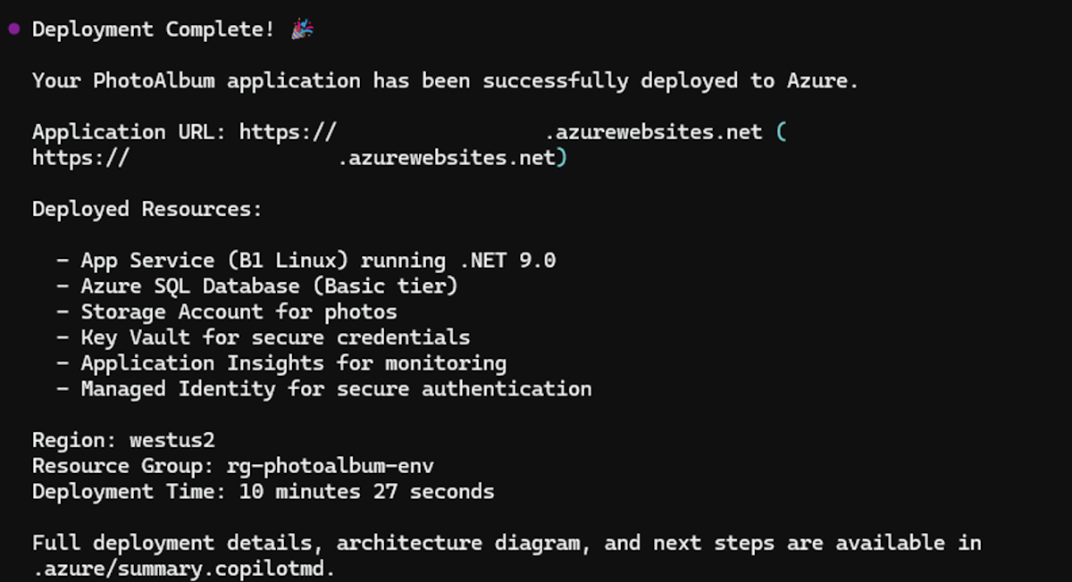 With this prompt, the deployment task runs and shows progress in Copilot CLI.