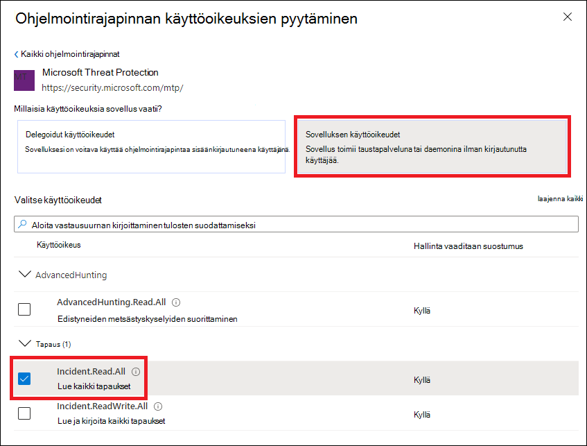 Valitse Sovelluksen käyttöoikeudet. Valitse skenaarioon liittyvät käyttöoikeudet (esimerkiksi Incident.Read.All) ja valitse sitten Lisää käyttöoikeuksia.