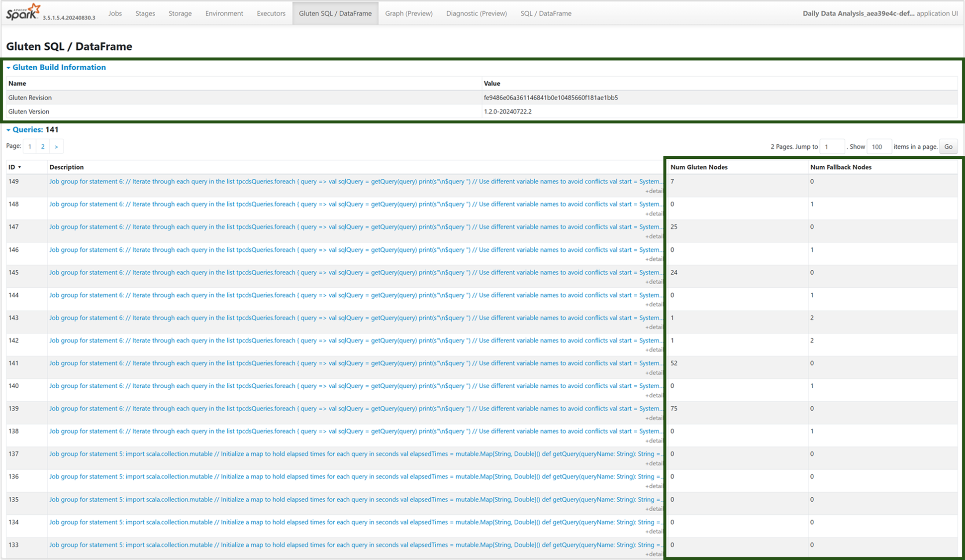 Etsi Spark-käyttöliittymän käyttöliittymässä näkyvästä kyselysuunnitelmasta solmun nimet, joiden päätteenä on Transformer, *NativeFileScan tai VeloxColumnarToRowExec. Liite ilmaisee, että alkuperäinen suoritusmoduuli suoritti toiminnon. Solmut voidaan esimerkiksi merkitä koosteiksi RollUpHashAggregateTransformer, ProjectExecTransformer, BroadcastHashJoinExecTransformer, ShuffledHashJoinExecTransformer tai BroadcastNestedLoopJoinExecTransformer. CSV-tietolähteissä natiiviskannaukset voivat näkyä natiivitiedostoskannauksena tai muuntajasolmuina Spark-käyttöliittymässä, samoin kuin Parquet- ja Delta-skannaussolmut.