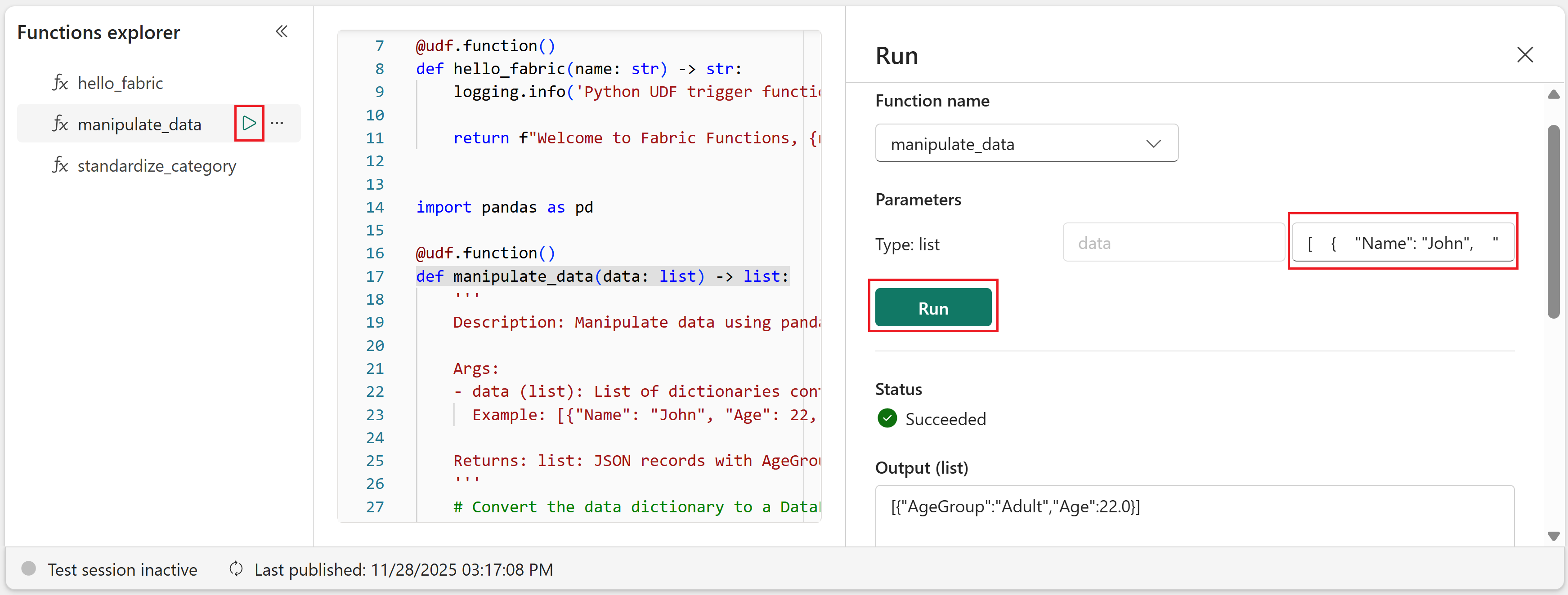 hello_fabricuudelleen muotoonhello_fabric1:@udf.function() def hello_fabric1(name: str) -> str: logging.info('Python UDF trigger function processed a request.') return f"Welcome to Fabric Functions, {name}, at {datetime.datetime.now()}!"Kun olet muuttanut nimen, tallenna nämä muutokset valitsemalla Julkaise.
