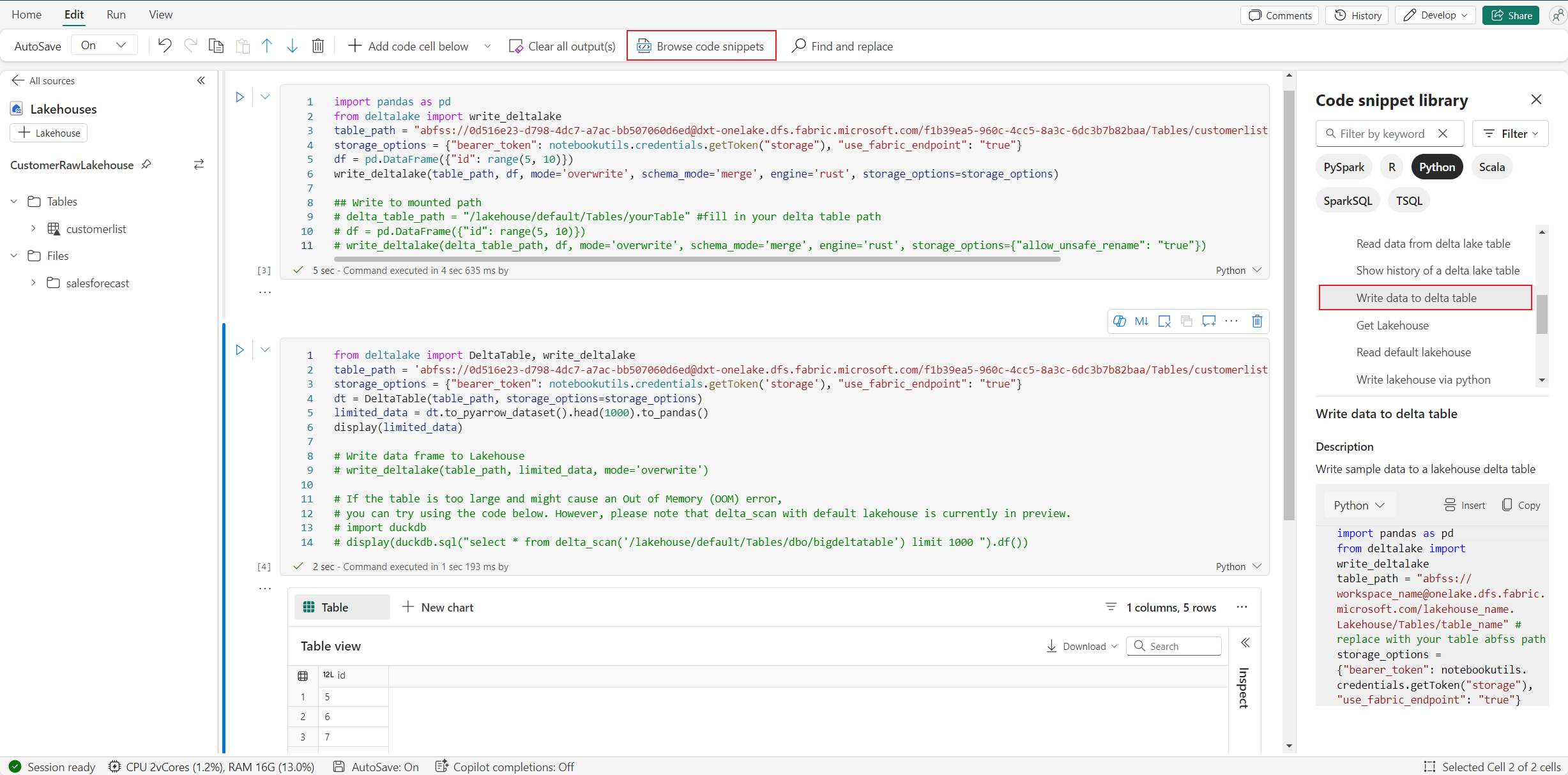 Löydät Lakehouse-toiminnon kirjoitustoiminnon kohdasta Selaa koodikatkelmaa –>Kirjoita tietoja delta-taulukkoon -.