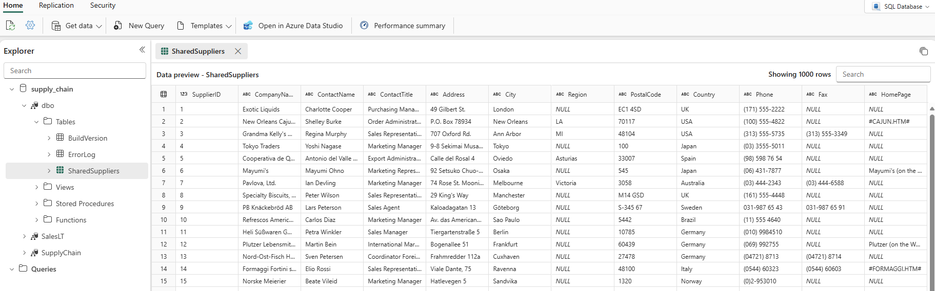 Sql-tietokanta Fabric-tietokannassa sisältää nyt Warehouse-tietoja. Käytät näitä tietoja tämän opetusohjelman myöhemmässä vaiheessa.