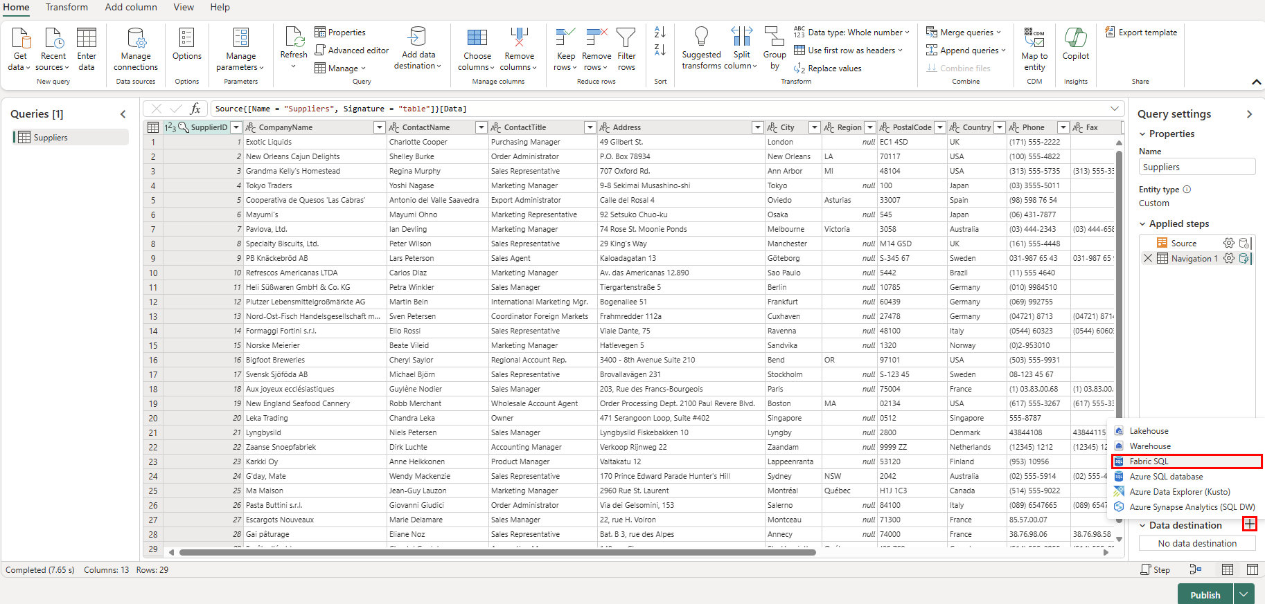 Microsoft Fabric -putket voivat sisältää tietovuon. Tietovuo Gen2 käyttää Power Query -käyttöliittymää, jonka avulla voit suorittaa muunnoksia ja muita toimintoja tiedoille. Käyttöliittymän avulla tuot tietoja Northwind Traders -yhtiöltä, jonka kanssa Contoso tekee yhteistyötä. Ne käyttävät tällä hetkellä samoja toimittajia, joten tuot niiden tiedot ja näytät näiden toimittajien nimet näkymän avulla, jonka luot opetusohjelman toisessa vaiheessa.