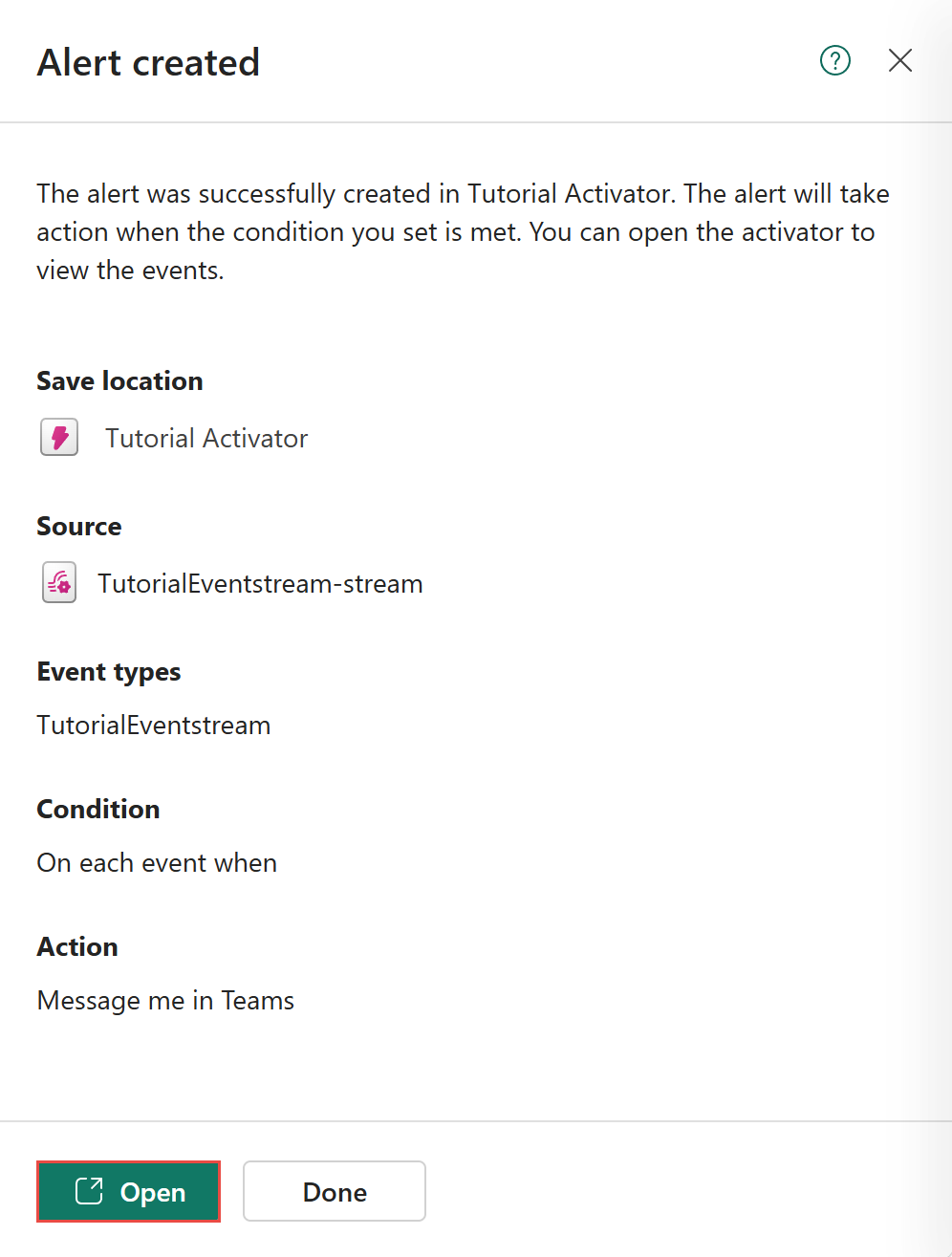 Hälytykset luotu -paneelissa valitse Avata ruudun alareunasta. Juuri luomasi Activator-esine avautuu uuteen välilehteen.