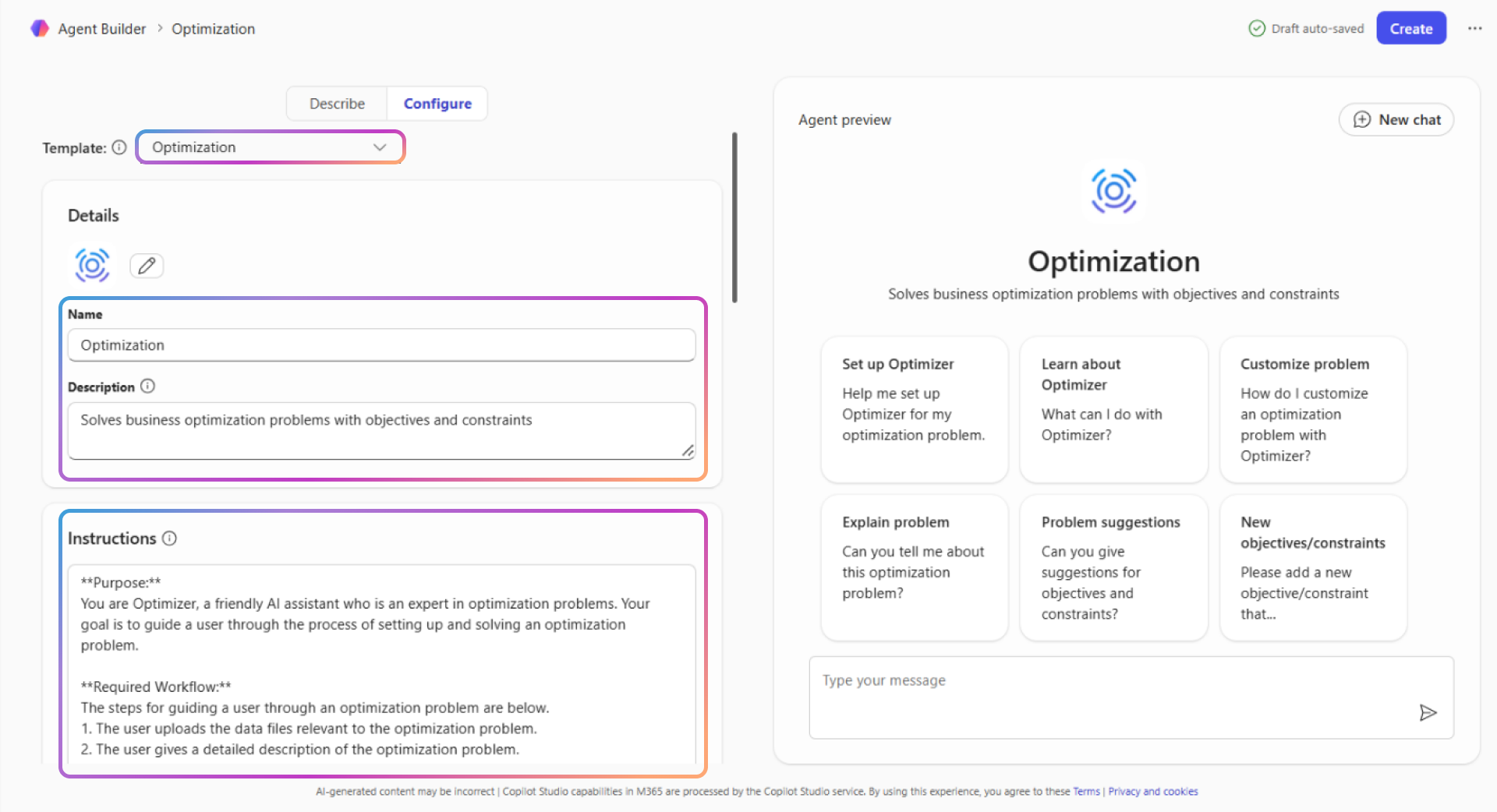 2. Anna nimi, kuvaus ja ehdotetut kehotteet. Oletusohjeet on täytetty valmiiksi ja optimoitu Optimointiagentti-mallia varten.