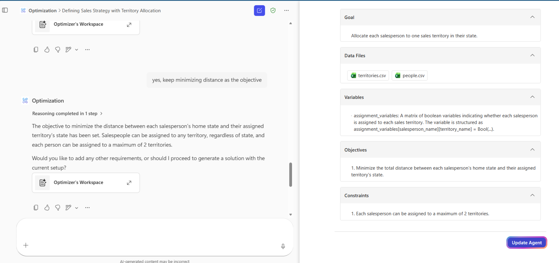 Käyttämällä viritettyä kontekstiagenttia voit tallentaa mukautetun optimointiongelman uudelleenkäyttöä varten koko organisaatiossasi. Agentti muistaa ongelmarakenteen, kuten tavoitteet, tavoitteet ja tietorakenteen.