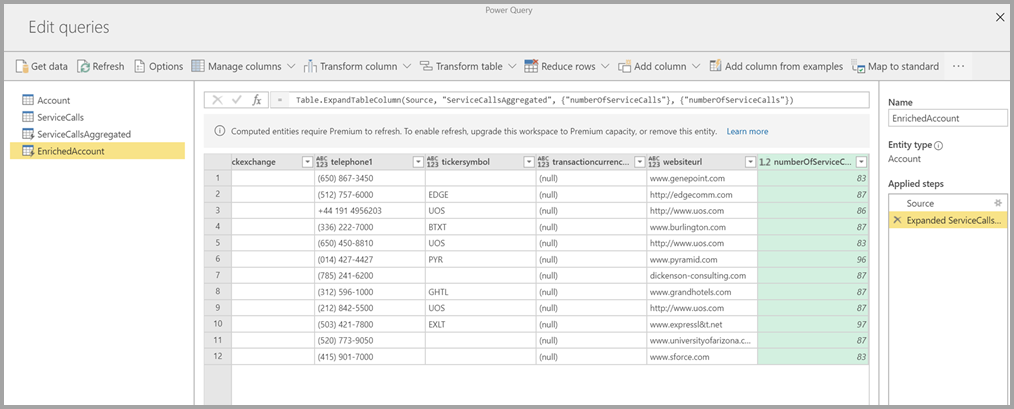 Seuraavaksi haluat yhdistää Tili-taulukonServiceCallsAggregated-taulukkoon rikastetun Tili-taulukon laskemiseksi.