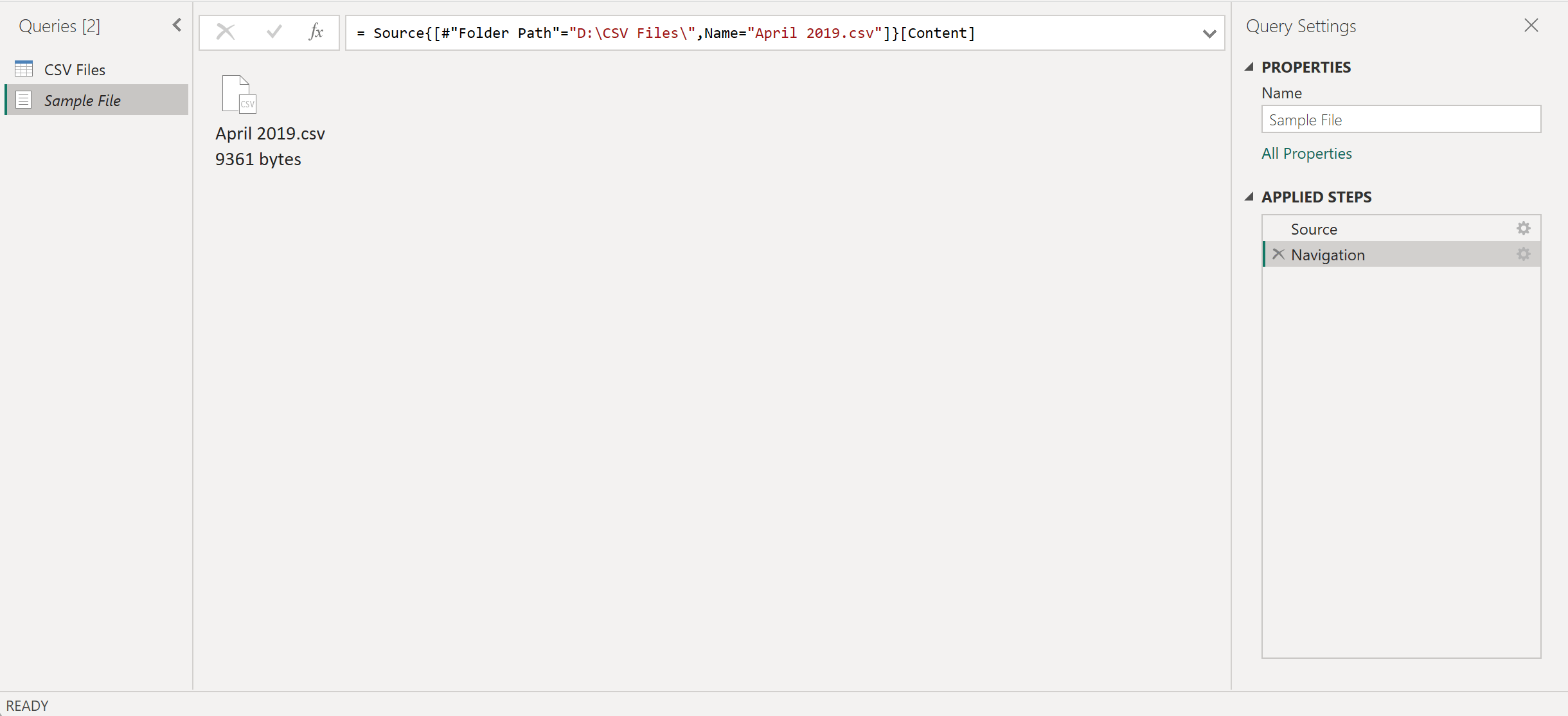 Aloita käyttämällä Folder Connector -kokemusta siirtyäksesi kansioon, jossa tiedostosi sijaitsevat, ja valitse Muunna Data tai Muokkaa. Nämä vaiheet vievät sinut Power Query -kokemukseen. Napsauta hiiren oikealla valitsemaasi binaariarvoa Sisältö-kentästä ja valitse Lisää uutena kyselynä. Tässä esimerkissä valinta tehtiin listalta ensimmäiselle tiedostolle, joka sattuu olemaan 2019.csv. huhtikuuta tiedosto.