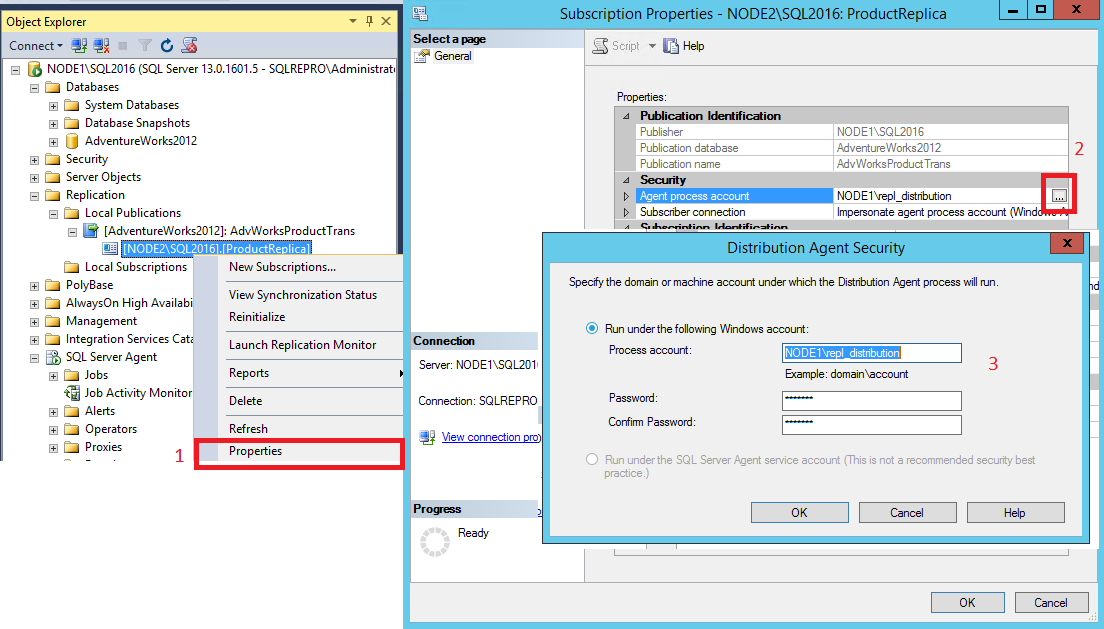 Connecting to Subscriber 'NODE2\SQL2016' Agent message code 20084. The process could not connect to Subscriber 'NODE2\SQL2016'. Number: 18456 Message: Login failed for user 'NODE2\repl_distribution'.This error indicates that the Distribution Agent couldn't connect to the subscriber, because the login failed for user NODE2\repl_distribution. To investigate further, connect to the subscriber and open the current SQL Server error log under the Management node in Object Explorer: