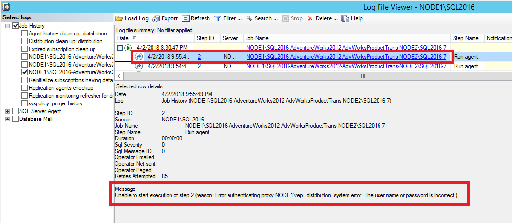 Error messages: Agent 'NODE1\SQL2016-AdventureWorks2022-AdvWorksProductTrans-NODE2\SQL2016-7' is retrying after an error. 89 retries attempted. See agent job history in the Jobs folder for more details.The error indicates that the Distribution Agent is retrying. To find more information, check the job history for the Distribution Agent: