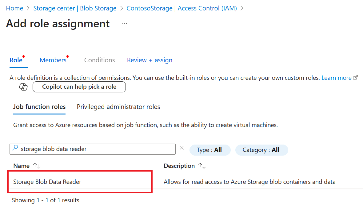 - Search for and select the Storage Blob Data Reader role. Then, select Next.