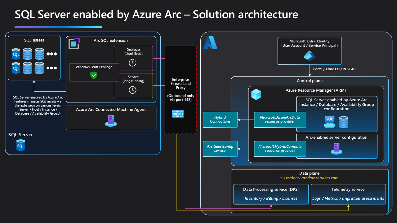 The SQL Server instance that you want to enable with Azure Arc can be installed in a virtual or physical machine running Windows or Linux. The Azure Connected Machine agent and the Azure Extension for SQL Server securely connect to Azure to establish communication channels with multiple Azure services using only outbound HTTPS traffic on TCP port 443 using Transport Layer Security (TLS). The Azure Connected Machine agent can communicate through a configurable HTTPS proxy server over Azure Express Route, Azure Private Link or over the Internet. Review the overview, network requirements, and prerequisites for the Azure Connected Machine agent.