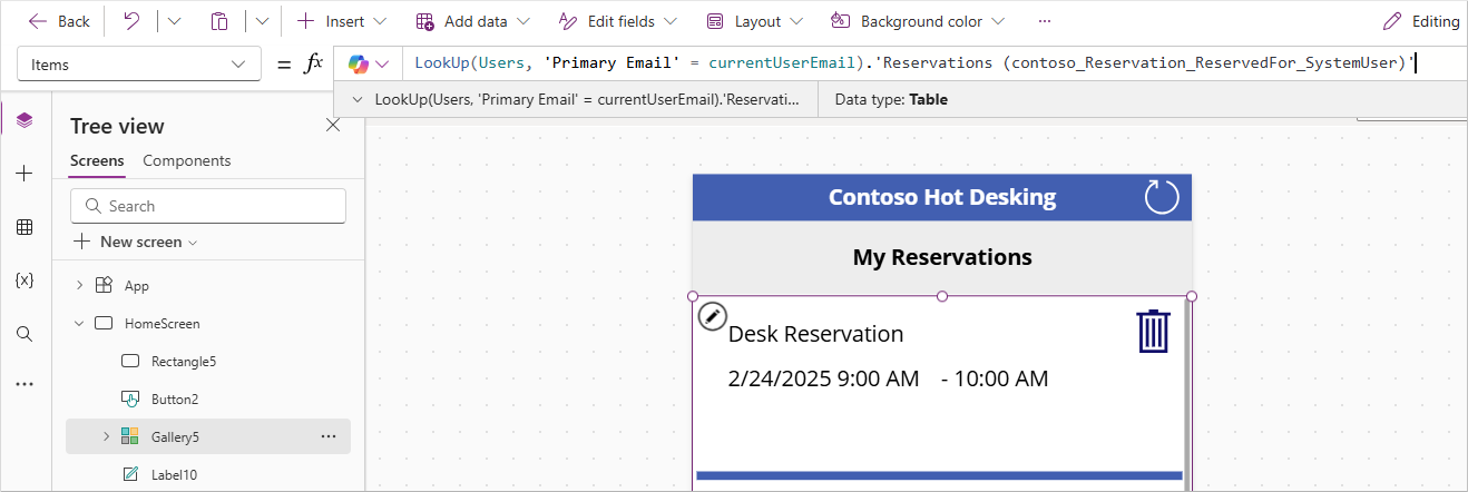 LookUp(Users,'Primary Email'=currentUserEmail).'Reservations (contoso_Reservation_ReservedFor_SystemUser)'Select the edit gallery icon.