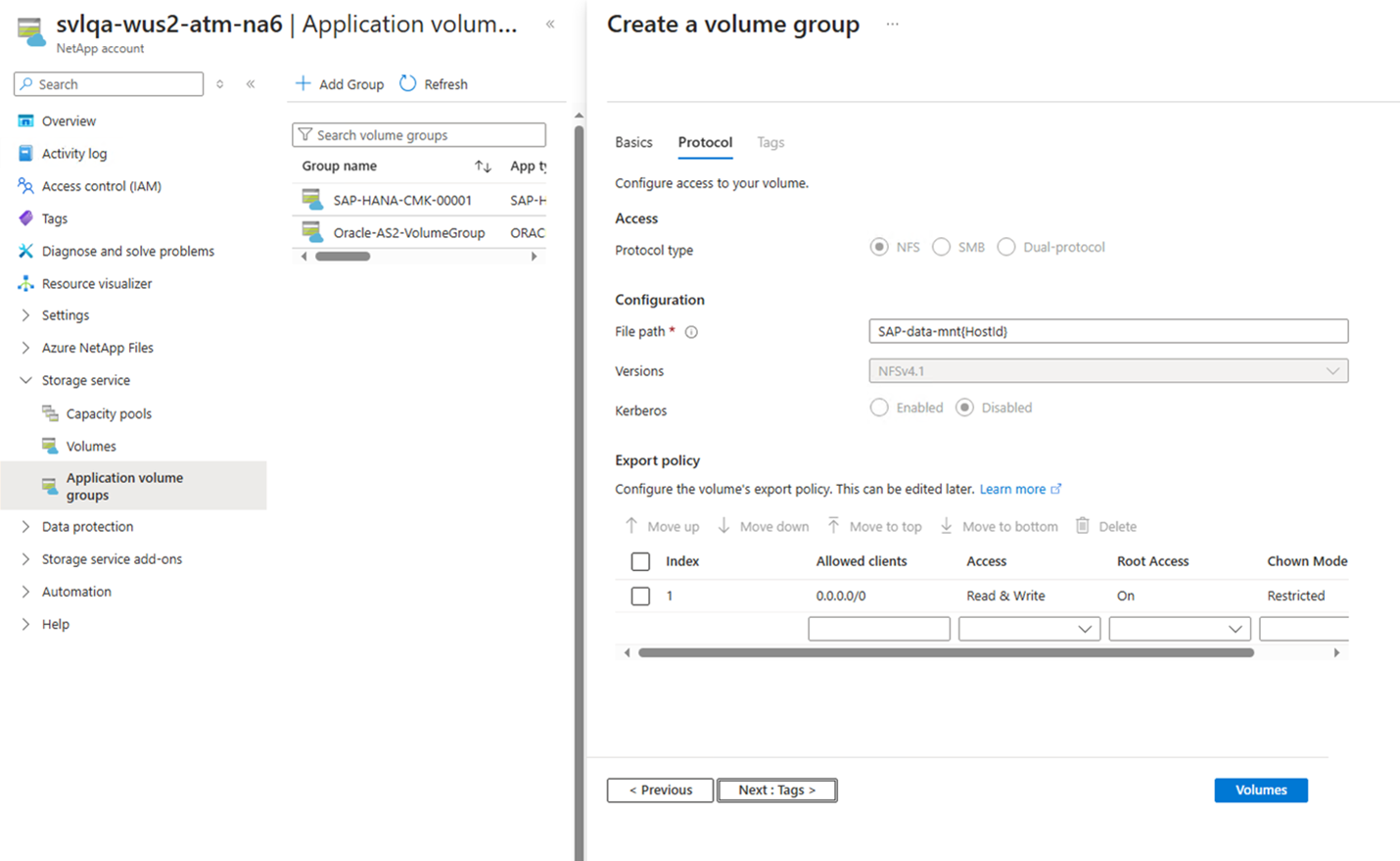- Requisiti e considerazioni per il gruppo di volumi di applicazioni per SAP HANA
