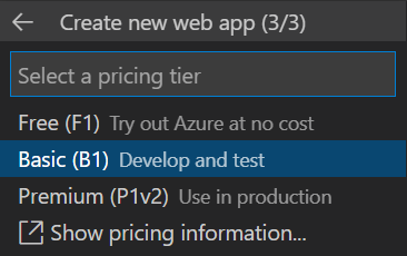 --skudefinisce le dimensioni (CPU, memoria) e il costo del piano di servizio app. Questo esempio usa il piano di servizio B1 (Basic), che comporta un costo ridotto nella sottoscrizione di Azure. Per un elenco completo dei piani di servizio app, vedere la pagina dei prezzi del servizio app. - Il flag