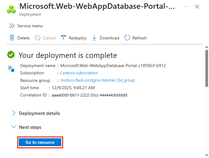 - In Gruppo di risorse selezionare msdocs-python-postgres-tutorial.