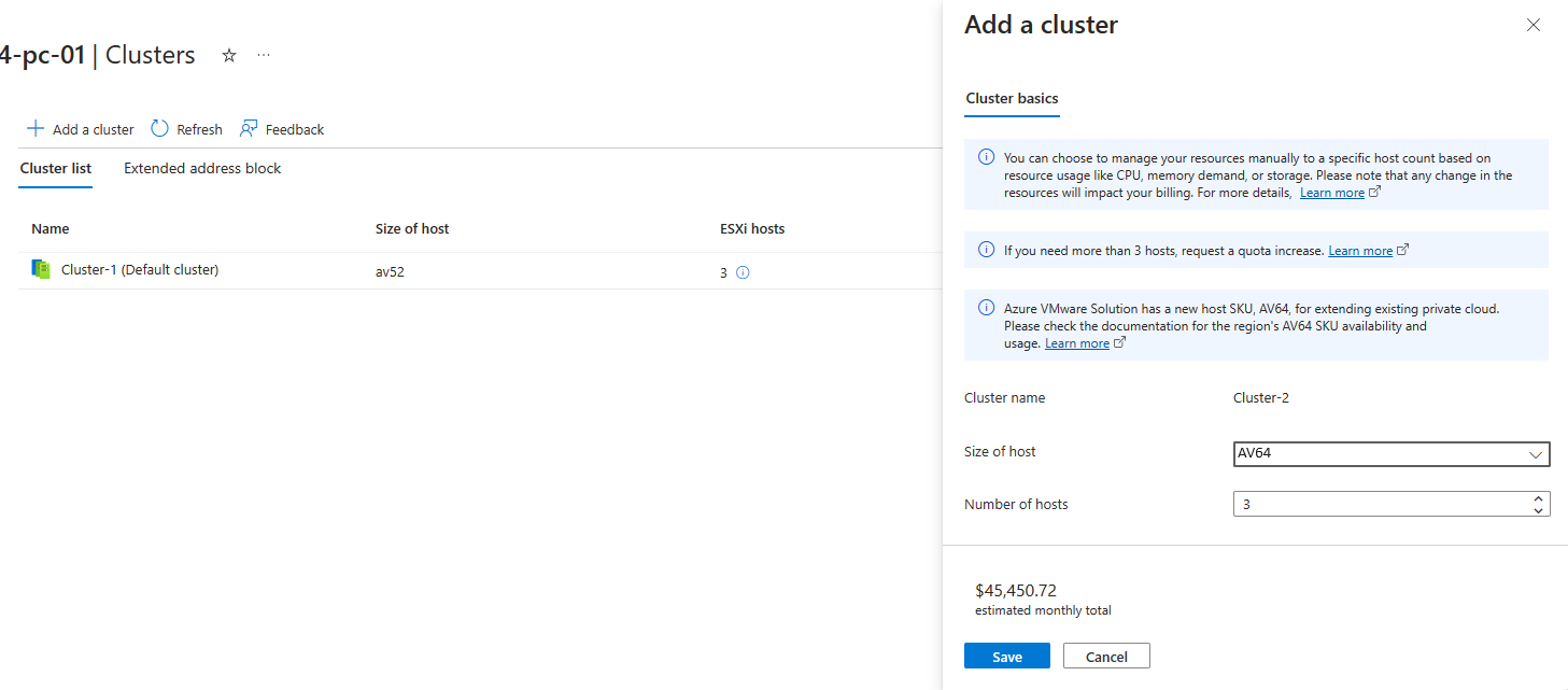 Se si prevede di usare lo SKU AV64, definire una rete per il piano di gestione e di controllo. Nel cloud privato della soluzione Azure VMware, in Gestisciselezionare Cluster>Aggiungere un cluster. Aggiungere quindi il Blocco di indirizzi per i cluster AV64 (una rete /23 o tre reti /25) nella scheda Blocco di indirizzi estesi e selezionare Salva.