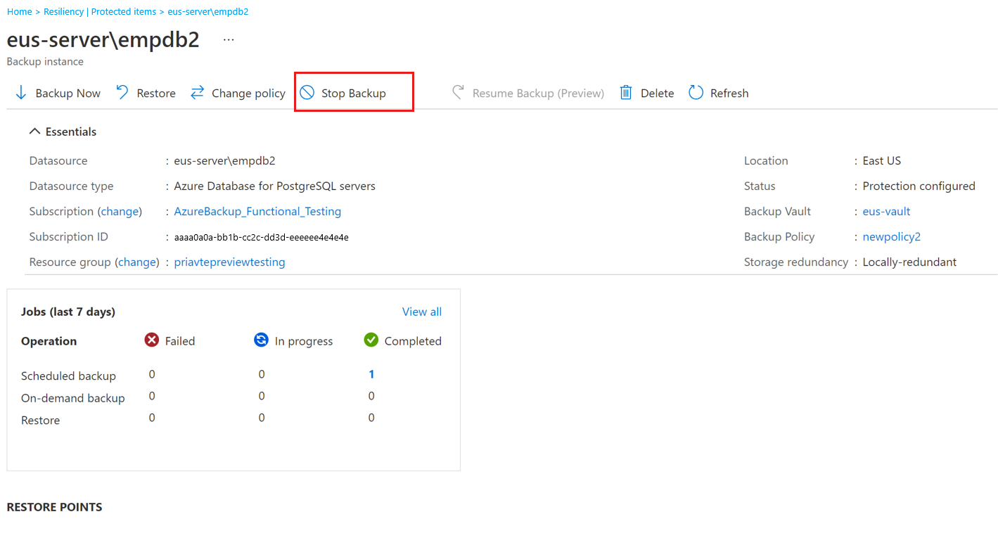 Arrestare il backup e conservare i dati in base a un criterio: questa opzione consente di arrestare tutti i processi di backup futuri per il server di Database di Azure per PostgreSQL. I punti di ripristino vengono conservati in base a un criterio e sono addebitati in base ai prezzi di Backup di Azure. Tuttavia, il punto di ripristino più recente viene mantenuto per sempre.