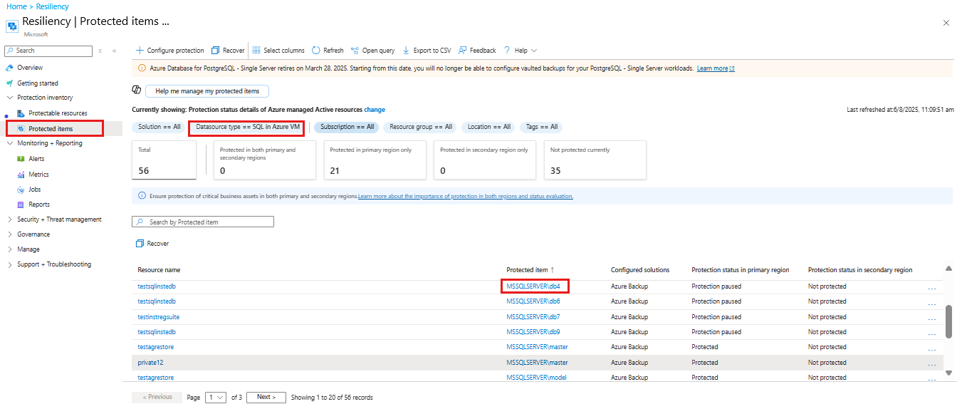Backup di Azure mostra tutte le operazioni pianificate e su richiesta in Processi in Resilienza nel portale di Azure, ad eccezione dei backup del log pianificati perché possono essere molto frequenti. I processi visualizzati in questo portale includono l'individuazione e la registrazione del database, la configurazione del backup e le operazioni di backup e ripristino.