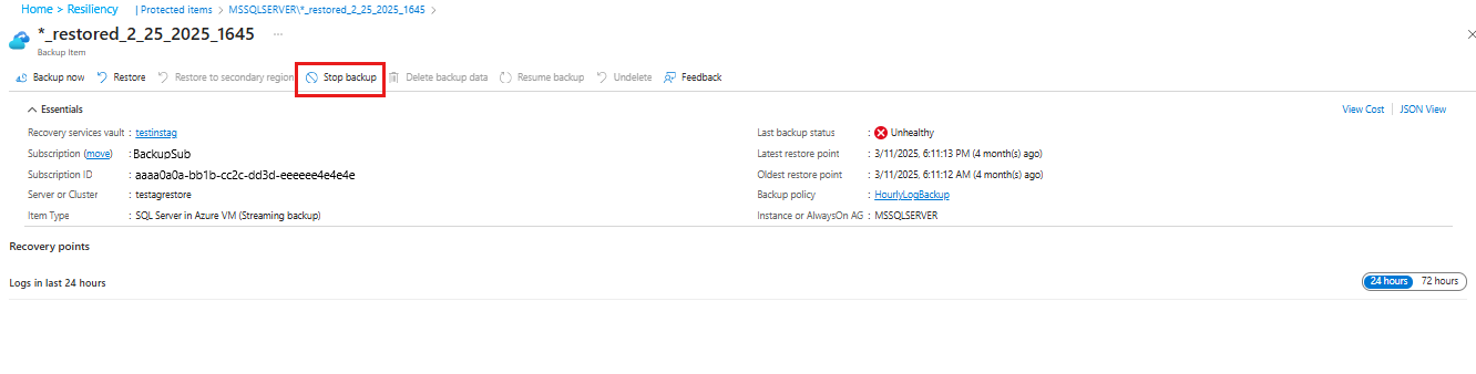 - Arrestare la protezione ed eliminare i dati di backup: arresta i processi di backup futuri per un database di SQL Server ed elimina tutti i dati di backup. Non è possibile ripristinare il database di SQL Server o usare l'opzione Riprendi backup .