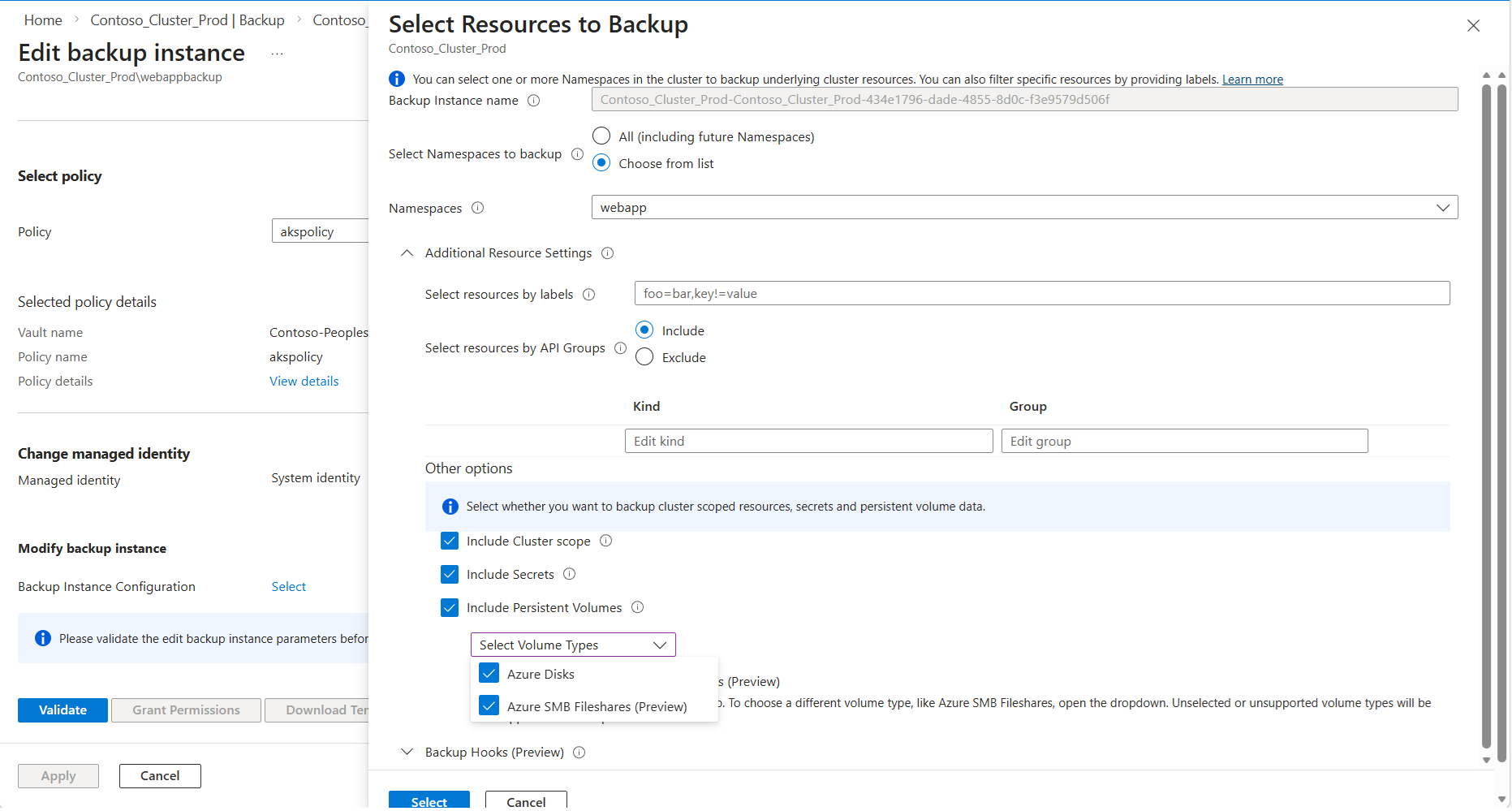 - Configurazione backup: definire le risorse del cluster di cui eseguire il backup.